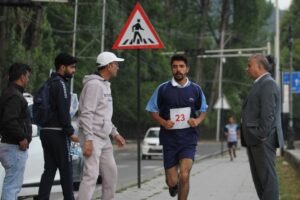 Prof. Sheikh Ajaz Bashir, Nodal Principal Kashmir Division Colleges and Principal Amar Singh College flagged-off the 8 Kms road race in the presence of Prof. Gurdeep Singh Sodhi Convener Sports Committee, and Dr. Tanveer Ahmad Bhat, Physical Director of the college.