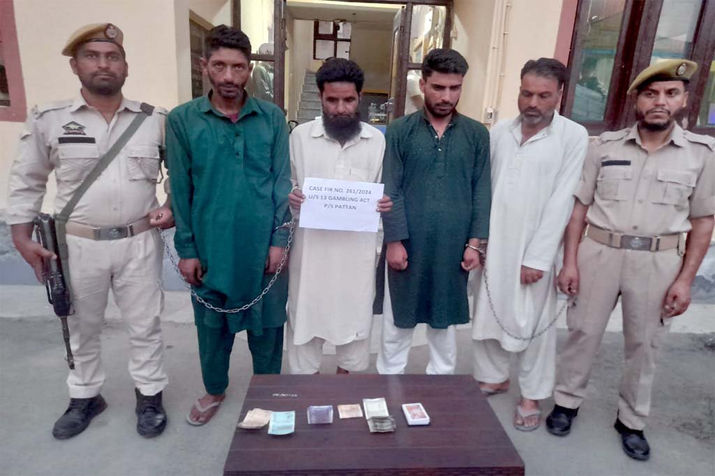 Acting on a reliable information regarding the gambling activities, a police party headed by SHO PS Pattan under the supervision of SDPO Pattan raided at Yamberzal Colony Pattan. During raid, 4 gamblers were arrested & stake money of ₹10,640/- & playing cards were recovered from their possession. They have been identified as Tariq Ahmad Malla son of Gh Hassan resident of Pattan, Bilal Ahmad Shah son of Ali Mohd resident of Kalsari, Firdous Ahmad Shah son of Hikmatullah resident of Pattan & Tanvir Ahmad Shah son of Mohammad Yousuf resident of Kalsari. They have been shifted to police station where they remain in custody.